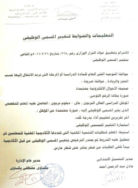 طلب تغيير المسمى الوظيفى للمعلمين لجميع المراحل والمواد والاوراق المطلوبة للتقديم بجميع الادارات التعليمية
