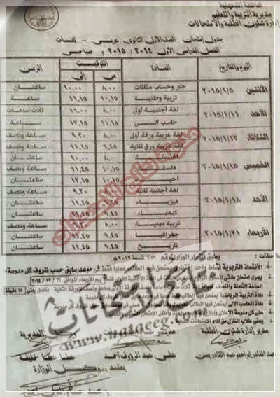 جدول امتحانات الفصل الدراسي الأول للمرحلة الثانوية بالدقهلية العام الدراسي 2015 2016 جريدة الفراعنة