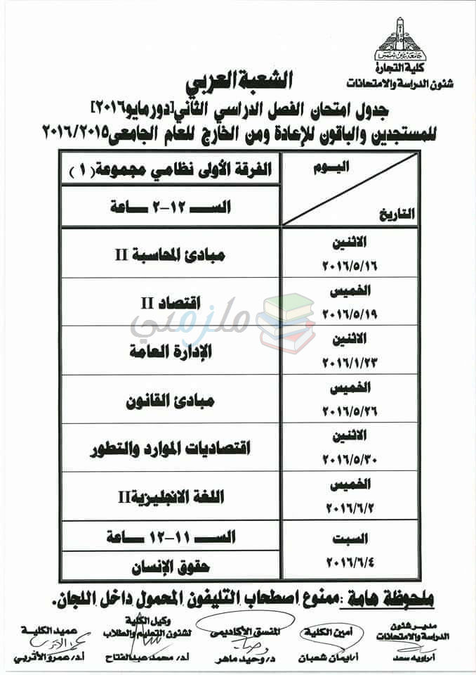 جدول امتحانات تجارة عين شمس الترم الثاني 2016 ملزمتي