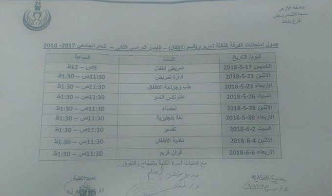 جدول امتحانات كلية التمريض بجامعة الازهر 2019